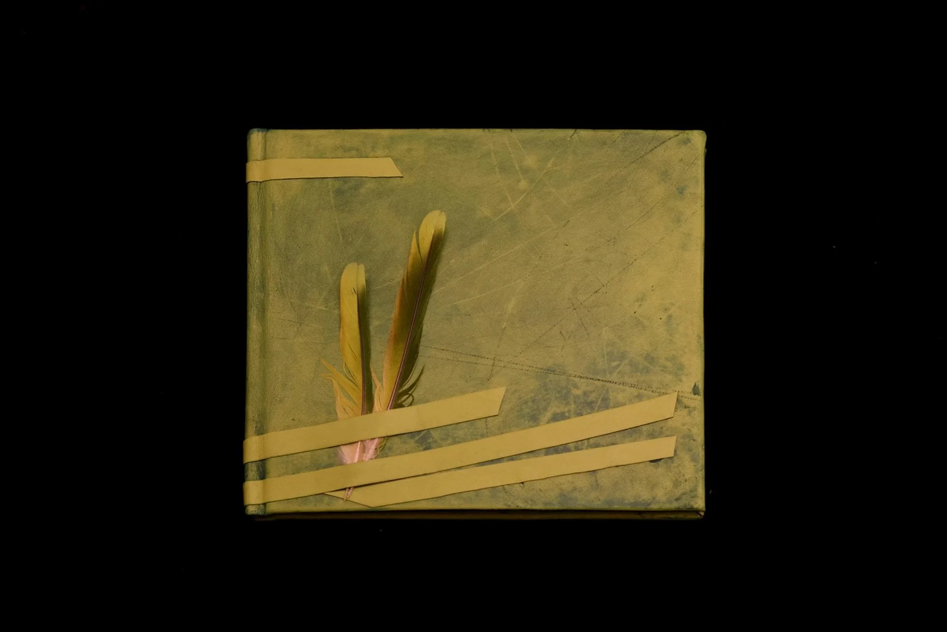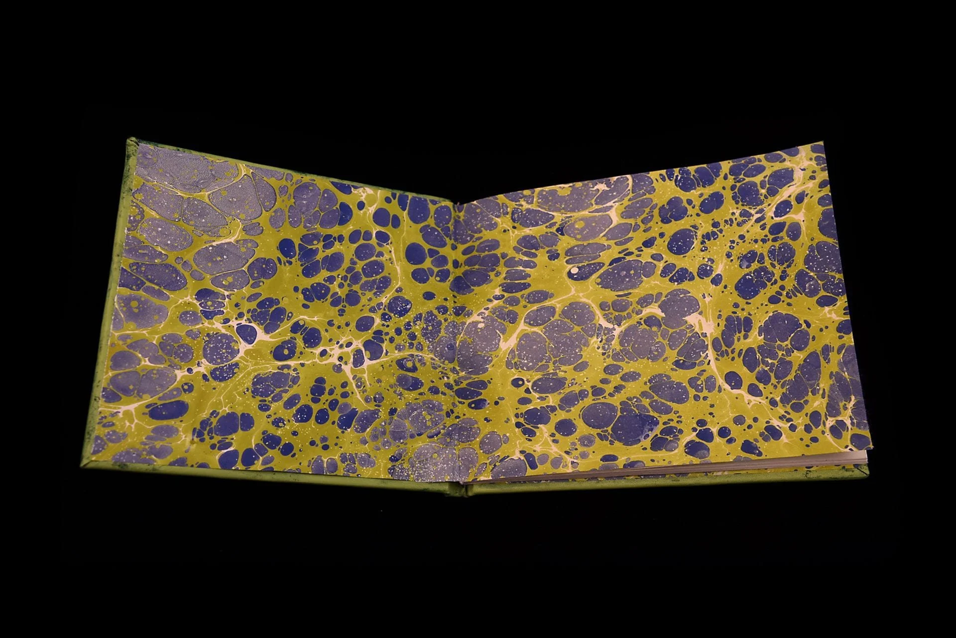Covered in a bright yellow-green calfskin, the leather was sanded, distressed, and dyed with blue inks and features blue and green feathers from the binder’s Quaker parrot, Django. A green and blue hand-marbled paper by Catherine Levine is used for the endsheets.